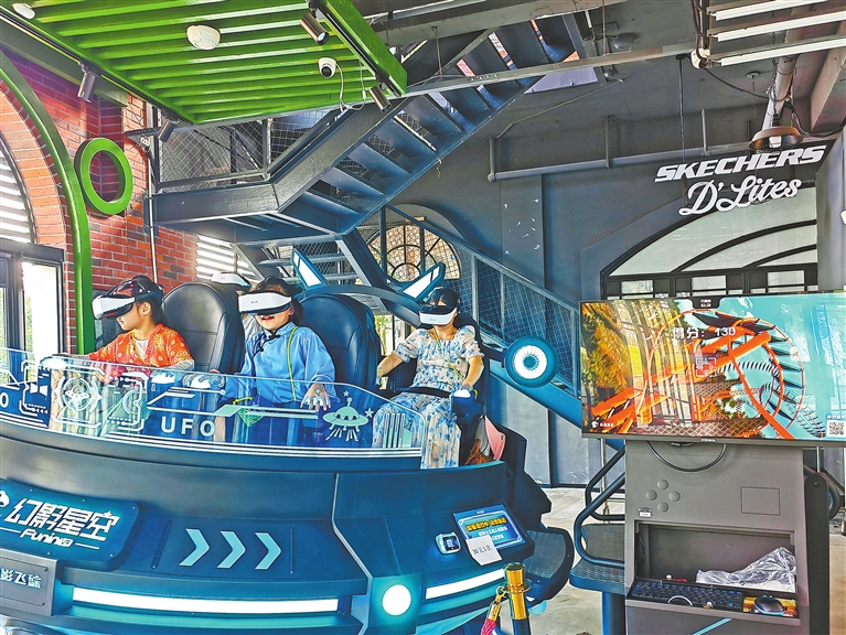 位于南昌县的原城纪·南昌城市文化街区,通过挖掘、还原城市记忆,打造沉浸式休闲消费体验场景,受到不少游客青睐。图为10月12日,游客在街区的VR体验馆体验VR项目。