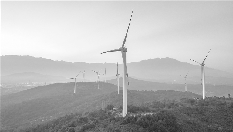 10月9日,庐山市白鹿镇数十台风力发电机组迎风旋转,源源不断输送出绿色清洁能源。 本报全媒体记者 张翰林摄