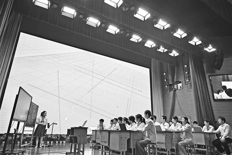 10月14日,南昌市第二中学绿茵路校区举办“VR技术在物理学科中的教学应用”主题活动,通过虚拟平台完成在传统课堂上“做不到”的实验。图为教师使用“电磁场虚拟仿真实验室”VR教学工具给学生上物理课。 本报全媒体记者 蔡铖歌摄