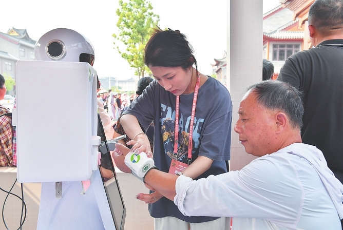 现场工作人员介绍,AI设备通过传感器和大数据分析,能在两分钟内完成脉象采集和体质辨识,为医生诊断提供参考。义诊活动首日,这个特殊的“人机协同”诊区吸引了近千名市民游客前来体验。