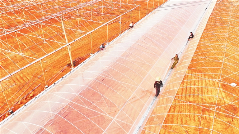 近年来,永丰县大力发展现代设施农业,以智慧农业赋能乡村振兴。图为10月16日,该县恩江镇聂家村,工人正在果蔬基地搭建连体智能大棚。