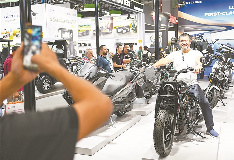 10月19日,客商在138届广交会展馆摩托车展区与摩托车产品合影留念。