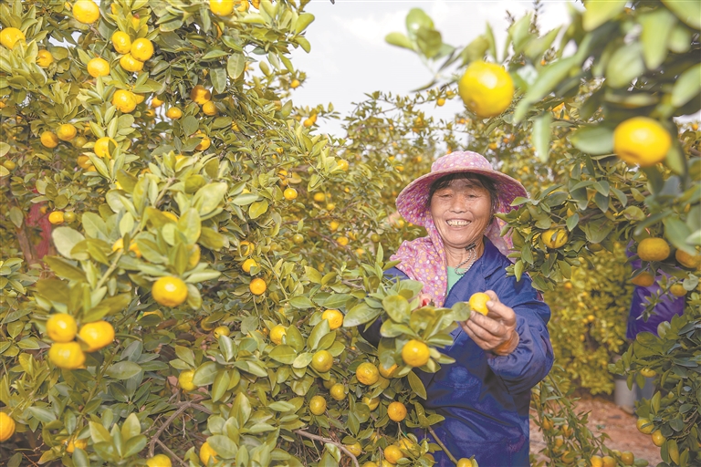 近年来,樟树市持续扩大果树种植面积,鼓励农户和合作社开展高经济价值水果种植,让一棵棵小果树结出乡村振兴“金果果”。图为10月16日,吴城乡新溪村千亩蜜橘种植基地丰收,果农在采摘蜜橘。