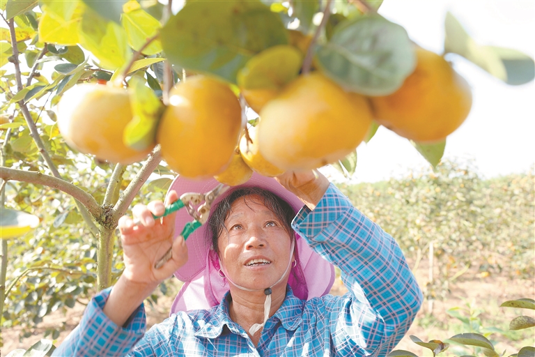 10月15日,泰和县灌溪镇阳丘村茂盛家庭农场甜柿种植基地,果农正在采收甜柿上市销售。特约通讯员 邓和平摄