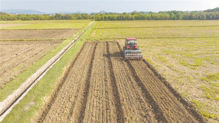 10月17日,横峰县莲荷乡丁家村,油菜种植户忙着翻犁土地、打沟、播撒油菜种子,抢抓农时助增收。
