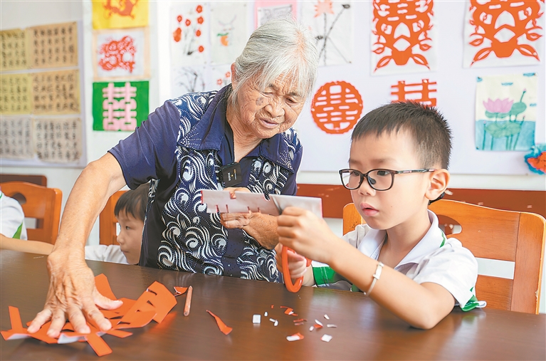 秋天的风,带着淡淡的果香。信丰县嘉定镇花园村文明实践站里,不时传来剪刀划开纸张的沙沙声。肖春兰老师站在孩子们中间,布满皱纹的手捏着剪刀,转几个圈就剪出一个大大的“囍”字——这是她陪伴村里留守儿童的第22个年头。从退休那年起,她就把“课后辅导”变成了自己的“新工作”。