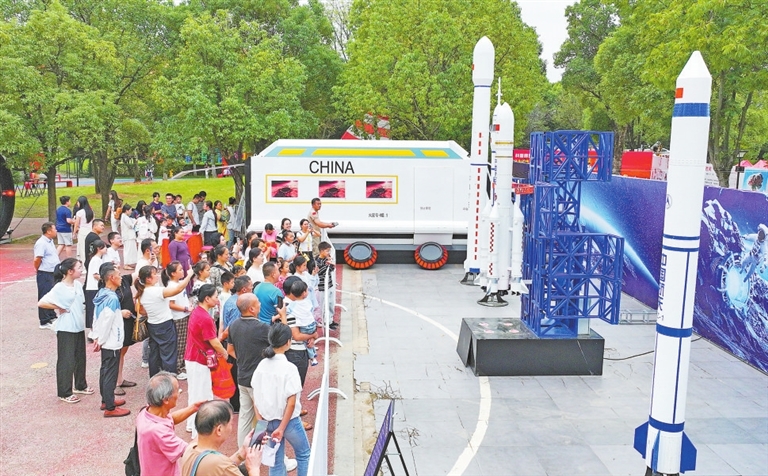 10月18日,抚州市三翁花园举办“爱国拥军 强国有我”航空航天国防科普展,吸引众多中小学生和市民前来参观。