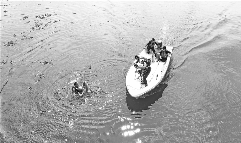 10月17日,在赣州市章贡区章江水域,救援队员正进行水上救援演练,全面提升水上突发事件的快速反应、应急指挥、高效处置和多方协同作战能力。特约通讯员 胡江涛摄