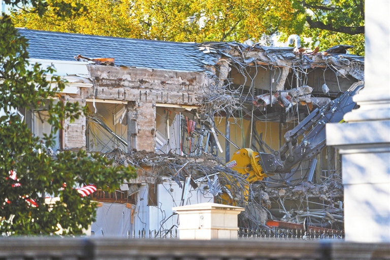 综合多家外媒报道,特朗普当天在白宫接见路易斯安那州立大学棒球运动员时提及有关工程,并表示访客“可能会不时听到施工声音”。法新社记者在现场看到,挖掘机拆除了东翼楼的外墙立面,砖块、碎石和钢筋散落一地。
