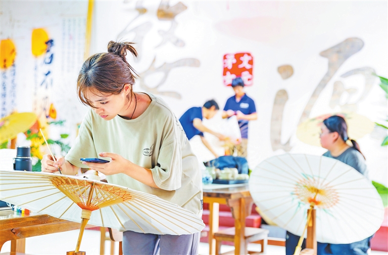 婺源县深挖当地民俗资源,突破文化展示静态模式,打造沉浸式体验场景,让游客从“观赏”变为“参与”,为乡村旅游注入内生动力。图为近日,在思口镇前坦村矛文女元非遗体验馆,游客跟着匠人体验炒茶、制作油纸伞。本报全媒体记者 徐 铮摄