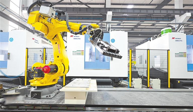 近日,位于景德镇高新区的江西省信航航空科技有限公司车间,机械臂正在进行自动化取件。公司通过数字化改造,生产效率提升125%。