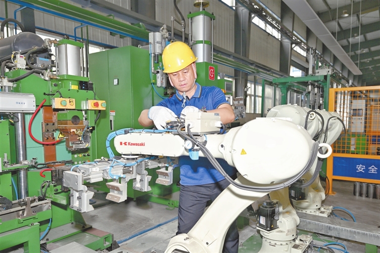 近年来,九江经开区积极引导企业“智改数转”,推动数字赋能制造业高质量发展。图为近日,九江洋泰金属制品有限公司生产车间内,员工正在调试智能化生产线。