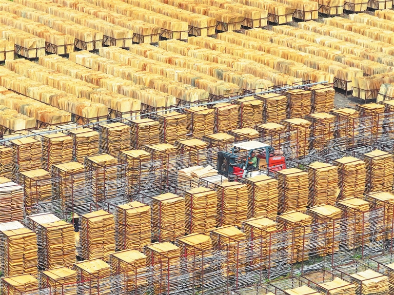 泰和县积极发展林业经济,利用林木边角废料进行精深加工,生产环保板材,变废为宝。图为10月17日,塘洲镇板材生产加工厂工人在晾晒板材半成品。