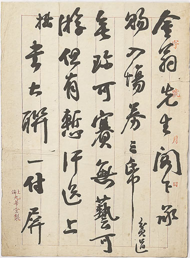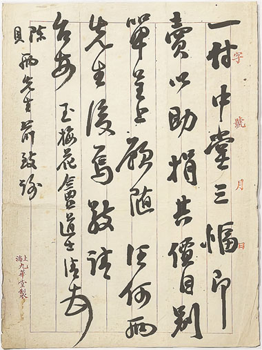 金翁先生阁下:承赐入场券三纸,贫道无珍可赛,无艺可游,但有惭汗。送上拙书大联一付、屏一付、中堂三幅,即卖以助捐。其价目别单呈上,愿随汪、何两先生后焉。敬请台安!玉梅花盦道士清顿首。陈、贝两先生前致谢!