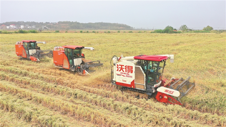 10月22日,彭泽县芙蓉农场,数台收割机正开足马力收割稻谷。特约通讯员 朱海鹏摄