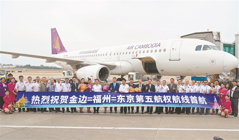 10月26日在福州长乐国际机场停机坪拍摄的首航庆祝仪式。10月26日,福建省首条第五航权客运航线“金边-福州-东京”航线正式启航。第五航权指一个国家的航空公司在经营某条国际航线的同时,获得在第三国经停并载运客货的权利。普通国际航线一般在两个国家间通航,一旦开放第五航权,则意味着航空公司可以在第三国载运客货,实现三个国家之间运输。该航线将柬埔寨金边、中国福州以及日本东京紧密相连,对于促进三国经贸文化交流合作以及区域经济发展等具有重要意义。 新华社记者 林善传摄