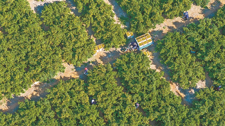 十月的风,吹黄了山野,也催熟了满树的蜜橘。10月24日,记者来到新余市渝水区姚圩镇七里山,只见万亩橘林连绵起伏,金黄的蜜橘缀满枝头,很是喜人。果园内,果农们的身影在繁枝密叶间隐现,巧手翻飞间,一颗颗饱满的蜜橘被轻巧地剪下,放入果筐。在姚圩镇蜜橘产业园,工作人员正将刚采摘下来的蜜橘分拣、打包和装车,发往国内外各大市场。