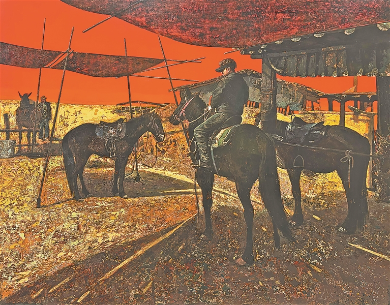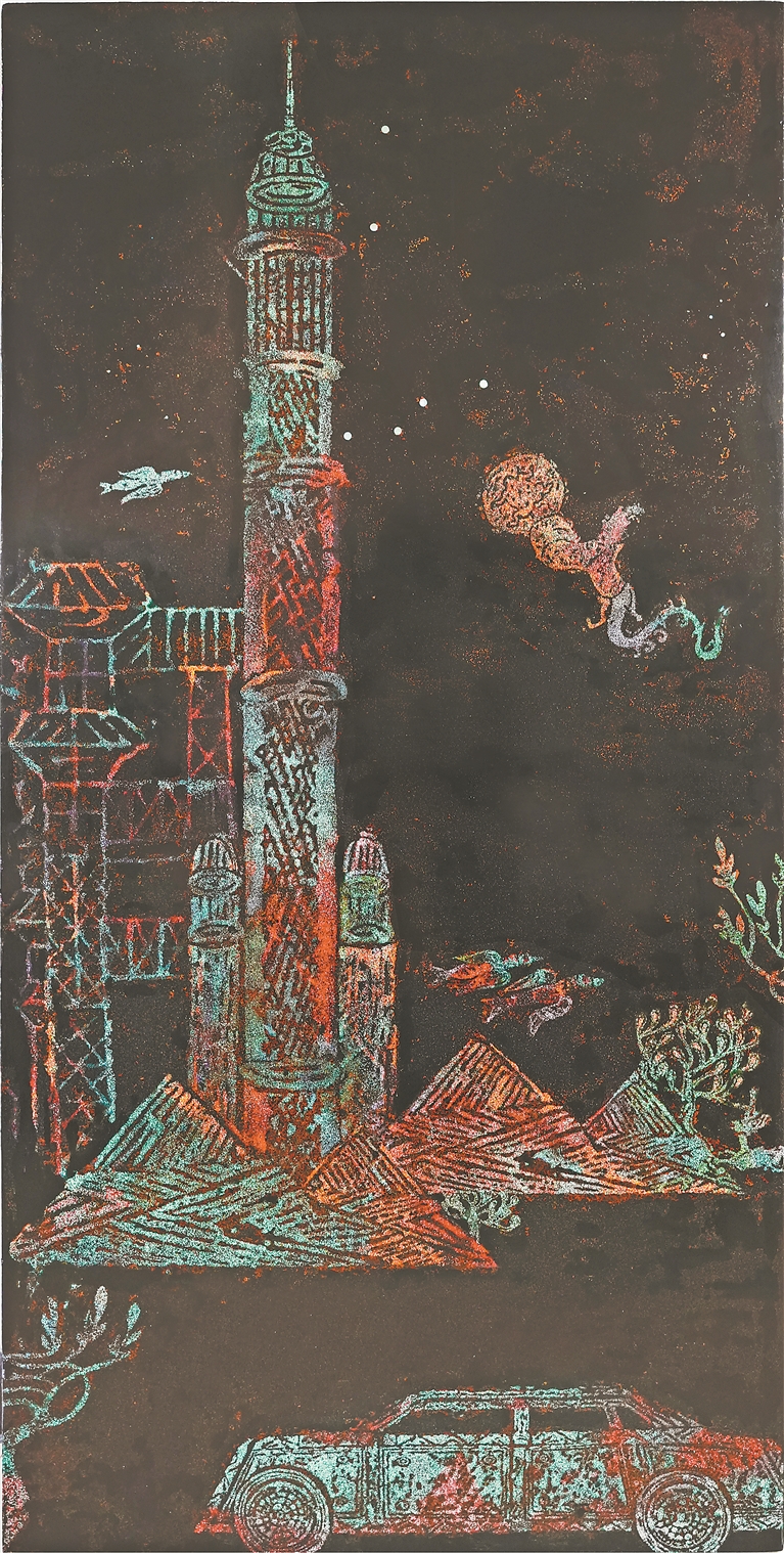 在技法上,艺术家们在继承传统技法的同时,借鉴西方绘画理念,运用“泼漆”“流漆”等手法制造偶然性,以形成强烈的感官冲击力。有的作品甚至采用高浮雕式厚涂,将画面解构为多个立体单元进行组合,突破漆画的平面局限,黄东兴的《历史与不朽》即为典型。此外,张征的《马场记》(左上图)通过堆漆、拓印预埋肌理,反复髹涂透明漆统一色调,并以细腻笔触丰富层次,利用银箔、铜箔贴附,强化质感,展现漆艺的包容性,在继承传统的同时凸显时代特征。