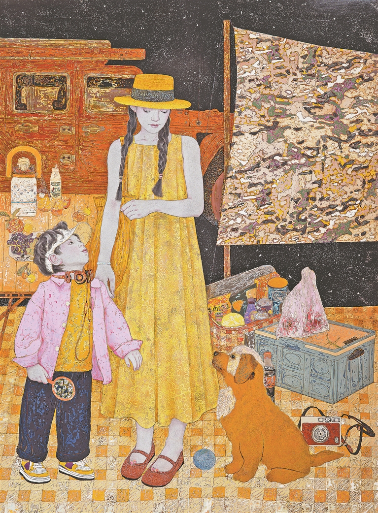 在风格语言上,作品呈现出“多元共生”的面貌。一些作品借鉴工笔技法,拓展语言深度。任淼艺的《Wi-Fi满格陪伴》(右下图),通过多层罩染,精细勾勒出人物和器物的细腻质感。还有一些作品则从写意中汲取灵感,以夸张造型、主观色彩与平面构图营造出强烈的视觉节奏和意境。抽象与观念类的作品也是艺术家重要探索类型,如蓝赟的《数字人生》不再追求形似,转而探索漆材本身的肌理美感与材质隐喻,表达对信息时代人类生存的思考。姚爱美的《岁月静好》,以西方艺术语言解构东方元素,沉稳的黑、白、灰调碰撞出新的审美范式,反映出作者对时间与空间的独特感知,成为文化自信的当代表达。