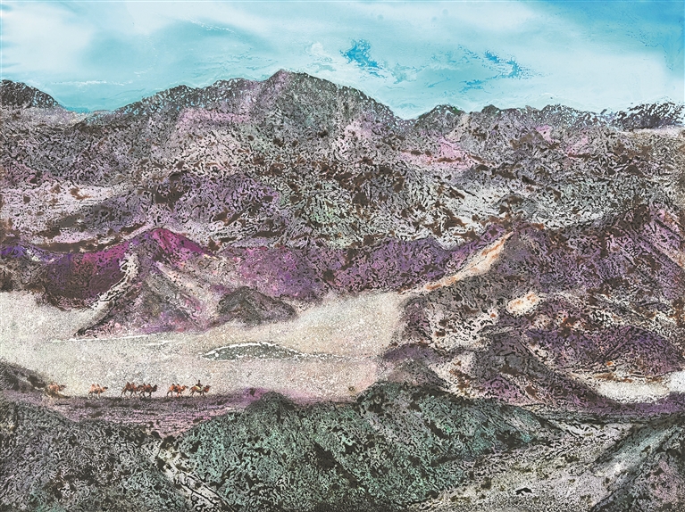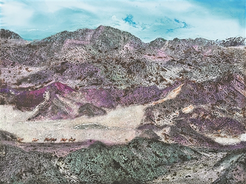 技法的跨界融合源于艺术家们对材料内涵的深刻把握。他们积极尝试金属、陶瓷、纤维的综合运用,增强作品的当代性。譬如,刘濮的《驼铃响·丝路兴》(左下图),将色漆颗粒、蛋壳粉、铝箔粉、木屑粉与螺钿碎屑等材料并置,背景使用银丸粉营造星空闪烁效果,突出细腻层次与自然纹理,不仅描绘了山河的瑰丽,更以材料语言诠释人与自然的和谐共生。
