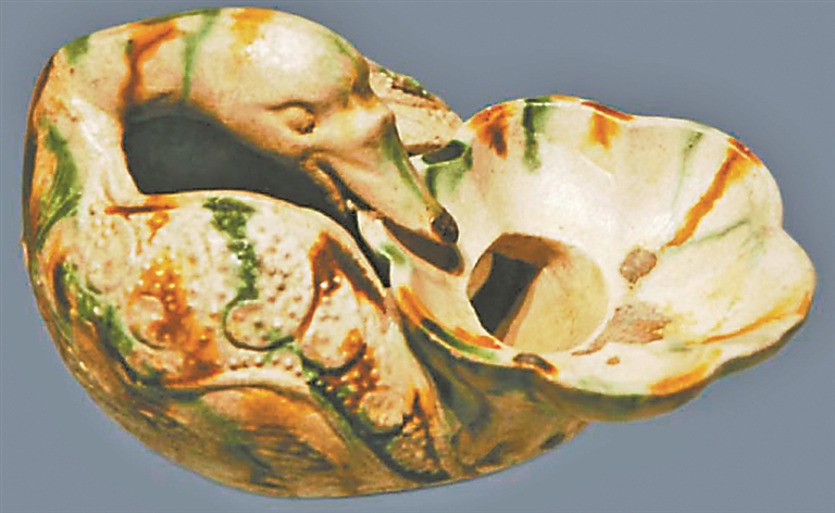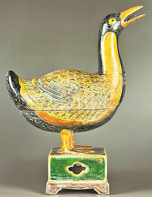 水鸭造型的熏香炉,是古代流行的熏香用具之一,常被称为“睡鸭”“金鸭”“香鸭”“宝鸭”等。在古代诗词中,有很多咏鸭形熏香炉的名句,如唐代诗人戴叔伦的“金鸭香销欲断魂,梨花春雨掩重门”、李商隐的“舞鸾镜匣收残黛,睡鸭香炉换夕熏”等。景德镇御窑博物院收藏的明代素三彩鸭形香熏(左图),分上下两截,上半截为盖子,下半截用于盛装香料,与子母口相合。鸭颈中空与口相通,鸭腹椭圆,腹部合缝处有6个巧妙的隐孔,这样可以让空气从隐孔进入鸭腹,与张开的鸭嘴对流,当熏香点燃置于鸭腹内,烟气便会从鸭嘴自然散发而出,弥漫开来。鸭足与中空的方形底座相连,底座四壁开光镂空,撇足,底部有青花书“大明成化年制”六字方形款。器底与鸭颈内腹施白釉,鸭首、腹部、尾部施墨绿色低温铅釉,鸭嘴、鸭足施黄色铅釉,颈、腹内刷黄釉,脚趾、背上羽毛及双翅锥刻处填孔雀绿釉。此器体形优美完整,造型写实生动,胎薄体轻,极富观赏性。