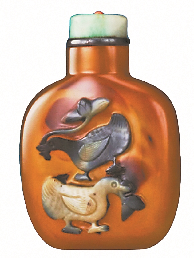 宝鸭穿莲为明清时期常见题材,作双鸭穿莲或卧鸭衔穗等,含有文人“玉池春水”之闲情逸趣。因“鸭”字侧边“甲”同“科甲”,有高中榜首、连发科甲之意;“莲”同“连”音,故宝鸭衔莲也寓意“状元及第”“连连高升”。2023年,某大型拍卖会曾拍出一件清代玛瑙巧雕宝鸭衔莲鼻烟壶(下左图),玛瑙色泽如蜜,质地柔润,直口丰肩,长方形扁腹,椭圆形浅圈足。壶腹一面巧用灰黑与米白色玉皮雕琢宝鸭衔莲,白鸭在前,黑鸭在后,身体肥硕,双翅收拢于两侧,口衔一截莲茎,莲茎弯转,末端莲花绽放,娇媚可人。匠人利用玛瑙的原色精心设计,构思巧妙。