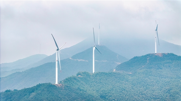 近年来,丰城市坚持生态优先、绿色发展,积极布局风电、光伏等清洁能源产业。图为10月26日,洛市镇风力发电机组迎风旋转,将风能转化为源源不断的绿色电能。