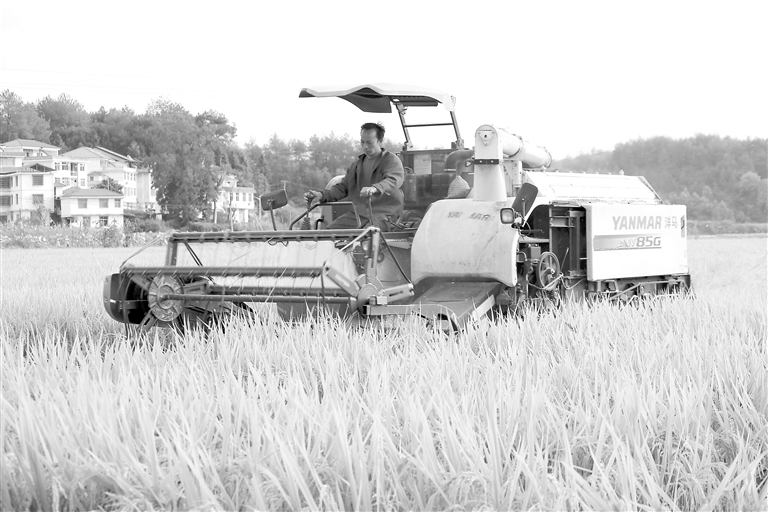 10月24日,在石城县高田镇田心村,村民正驾驶农机收割晚稻,确保颗粒归仓。