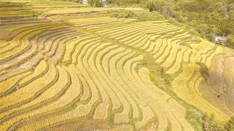 近日,大余县河洞乡长岭村高山梯田水稻陆续成熟,金黄稻浪在层层梯田上勾勒出优美曲线,一派丰收景象。