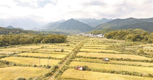 10月23日,九江市濂溪区高标准农田里,金色稻浪随风起伏,九派城乡发展集团有限公司正组织机械抢收晚稻。