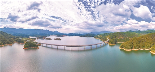 近年来,靖安县持续做好山水文章,全县森林覆盖率由84.1%提升至84.25%。图为10月27日无人机航拍的官庄镇塘埠大桥与蓝天碧水、两岸青山,美如画卷。本报全媒体记者 张翰林摄