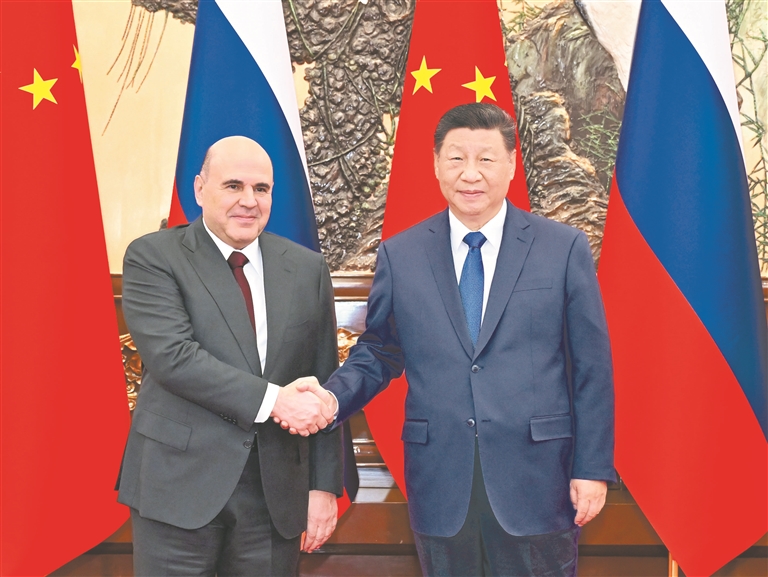 习近平指出,今年以来,中俄关系锚定更高水平、更高质量发展目标,在风高浪急的外部环境中笃定前行。维护好、巩固好、发展好中俄关系,是双方的战略抉择。我同普京总统在莫斯科和北京两次会晤,就中俄关系中的战略性、全局性问题深入交流,作出新的谋划和部署。双方要保持密切协调,落实好我同普京总统达成的重要共识,着眼两国和两国人民的根本利益,把中俄合作的蛋糕做好,也为世界和平与发展作出新的更大贡献。