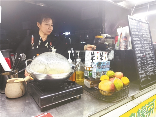 广富城夜市灯火通明、人来人往。彭剑莲在摊位上娴熟地忙碌,脸上漾着笑意。广告牌上,写着30多种饮品,有顾客正在挑选。“虽然是单亲妈妈,但感觉自己创业并不孤单。现在每天营业额有两三百元,读高三的儿子也很听话。”