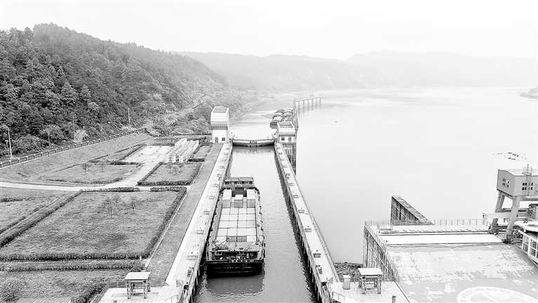 近年来,峡江县积极发展内河航运经济,着力提升通航能力。图为11月2日,该县巴邱镇蒋沙村水利枢纽航道,装载货物的船舶正在过闸。通讯员 宋靖辉摄