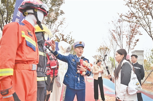 11月4日,2025年江西省“消防宣传月”活动启动仪式在南昌市水天消防广场举行,现场通过消防水域救援演示、搜救犬搜救演示、消防器材装备展示等,向市民普及消防安全知识,增强消防意识。图为消防员向市民直播介绍消防安全知识。本报全媒体记者 王蕴蓉摄