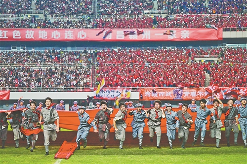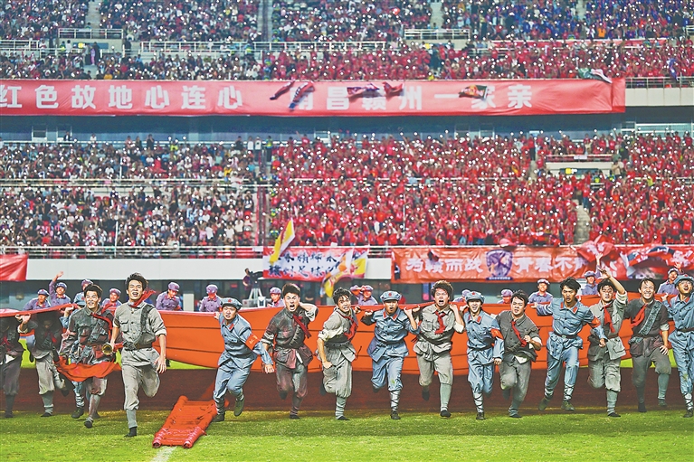从赣州4万名观众齐唱《十送红军》的红色共鸣,到新余智能机器人卡点舞蹈的科技律动;从鹰潭舞龙舞狮旋转跳跃的民俗欢腾,到九江《大湖之灵》舞剧的生态情怀;从万载烟花在夜空绽放出的璀璨图景,到乐平赣剧演员的腾跃翻扑……