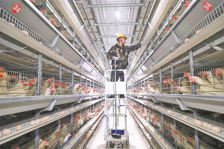 尝到甜头后,江桥社区乘势而上,2024年进一步扩大养殖规模,引进蛋鸡10万羽,并建设了新的养鸡场,引进全自动机械化养殖设备,建成集饲养管理、疫病防控、蛋品加工于一体的标准化生产线,实现从“养得活”到“养得好”再到“卖得出”的全链条升级。
