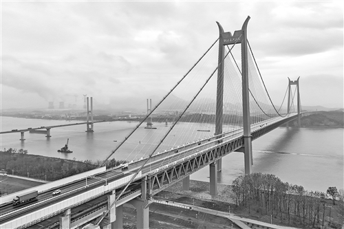11月6日,由中铁大桥局施工的铜陵长江三桥正式通车。该桥是我国首座双层斜拉—悬索协作体系大桥,路线全长11.9公里,具有高速公路、城际铁路、货运铁路三种过江功能。图为车辆行驶在正式通车的铜陵长江三桥上(无人机照片)。 新华社发 (储著传摄)