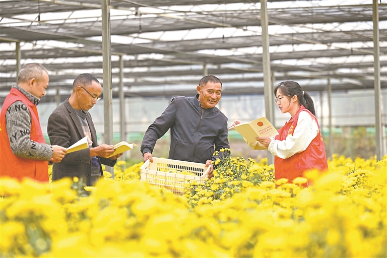 11月1日,《中华人民共和国法治宣传教育法》正式施行。为深入学习贯彻这部法律,高安市“法律明白人”深入田垄为农户答疑解惑。图为11月5日,在该市筠阳街道清湖村的菊花基地,“法律明白人”骨干与农户面对面宣传法律知识。本报全媒体记者 吴文兵摄