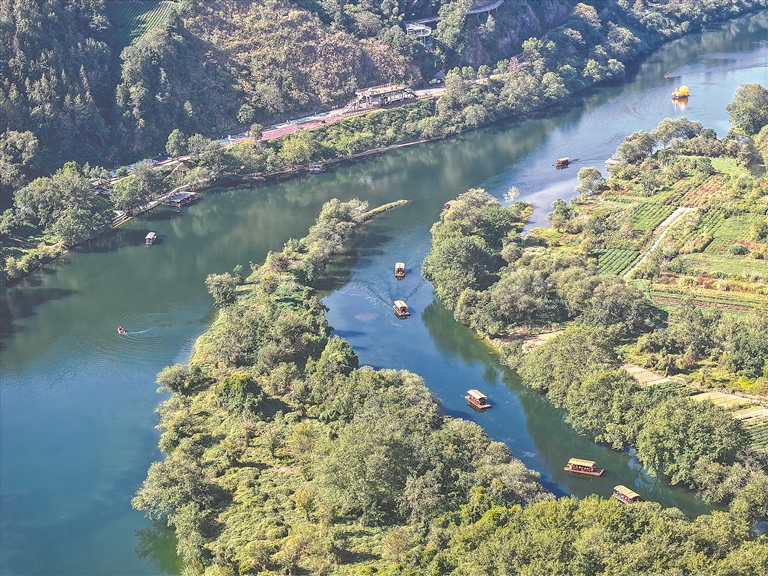 婺源县秋口镇王村地处饶河源国家湿地公园中心区,因地制宜建设和美乡村,将生态优势转化为发展优势,走出一条特色鲜明的乡村振兴之路。图为10月29日,游客乘坐竹筏在王村石门自然村观光。本报全媒体记者 吴文兵摄