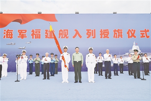 下午4时30分许,入列授旗仪式开始,全场高唱中华人民共和国国歌,五星红旗冉冉升起。仪仗礼兵护卫着八一军旗,正步行进到主席台前。习近平将八一军旗授予福建舰舰长、政治委员。福建舰舰长、政治委员向习近平敬礼,从习近平手中接过八一军旗。习近平同他们合影留念。入列授旗仪式在中国人民解放军军歌声中结束。