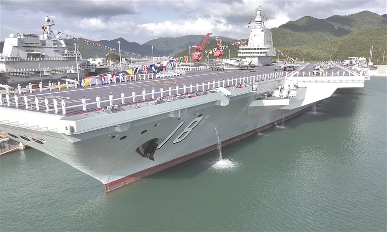 十一月的三亚,海阔天高,碧波浩瀚。军港内,福建舰踏海而立、满旗高悬,山东舰伏波相伴,来自海军部队和航母建设单位的代表2000余人在码头整齐列队,气氛隆重热烈。