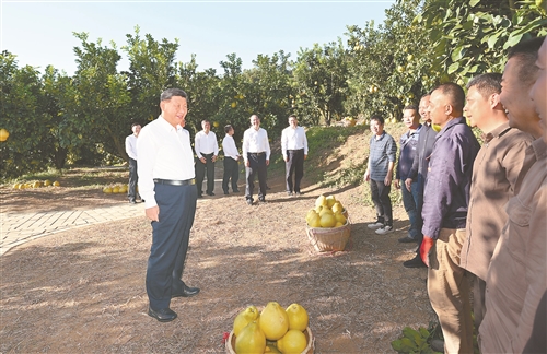 金柚是梅州的特色农产品。正值收获季节,柚子园硕果累累。习近平来到雁洋镇南福金柚种植基地,在展示厅听取广东加大对革命老区支持力度、推进乡村全面振兴等情况汇报,察看柚子及其加工产品、文创产品。他走进果林,同果农和农技人员亲切交流。得知今年金柚喜获丰收、销路畅通,习近平十分高兴。他指出,发展乡村特色产业是推进乡村全面振兴的基础,要加强科技应用,推动农文旅融合,不断延伸产业链、增加附加值,带动更多农民群众增收致富。