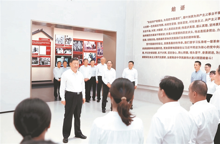 7日下午,习近平来到位于梅州市梅县区雁洋镇的叶剑英纪念园。在叶剑英纪念馆,习近平向叶剑英铜像敬献花篮,参观叶剑英生平事迹陈列。随后,又参观叶剑英故居。习近平强调,我们今天取得的伟大成就,都是建立在毛泽东等老一辈革命家打下的江山、攒下的家底之上的。要结合党史宣传教育,讲好老一辈无产阶级革命家的故事,教育引导广大干部群众特别是青少年传承红色基因、赓续红色血脉,永远听党话、跟党走。