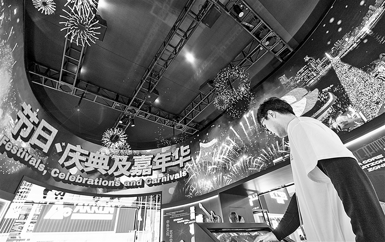 11月7日,第八届进博会服务贸易展区香港旅游发展局展位工作人员触摸屏幕开启全息投影。