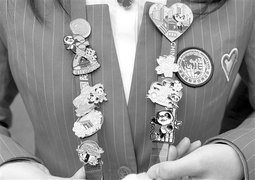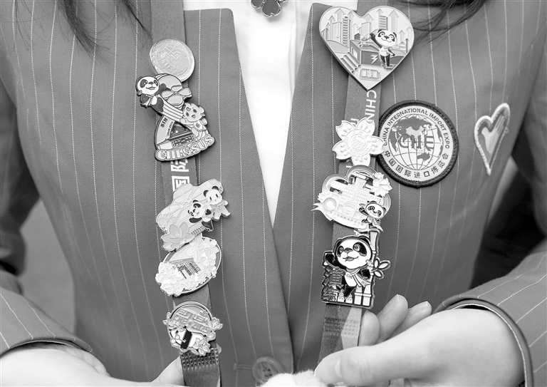 11月10日,一名志愿者展示自己在进博会上收集到的徽章。