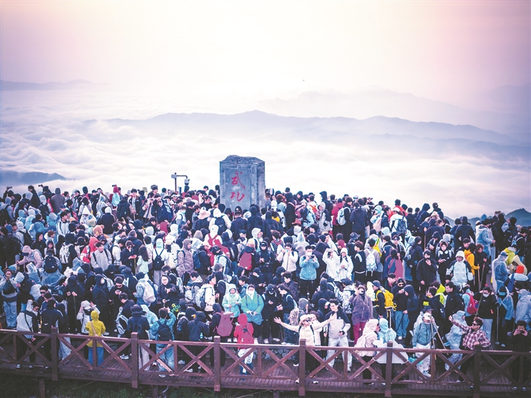 ⑤ 大批游客在武功山金顶石碑处与云海合影打卡。
