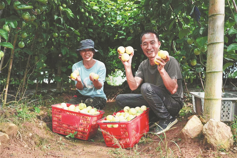 ⑥ 麻田镇蔡家村村民刘雪发在自家百香果基地采摘新鲜的百香果。