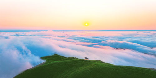 ⑧ 清晨时分,朝阳初升,云海弥漫在万亩草甸之上,蔚为壮观。
