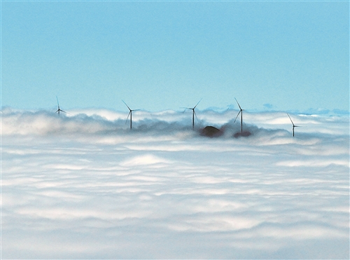 吉安市泰和县水槎乡天湖山上,云雾缭绕,一座座风机若隐若现,铺展成一幅雄浑又灵动的壮美画卷。邓和平摄